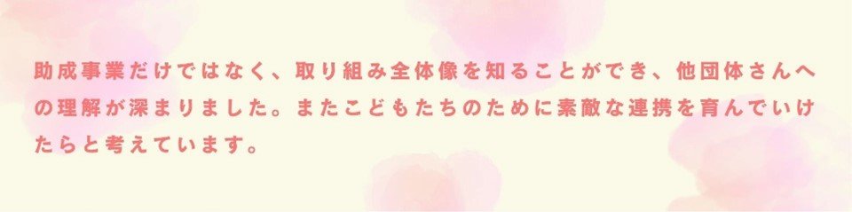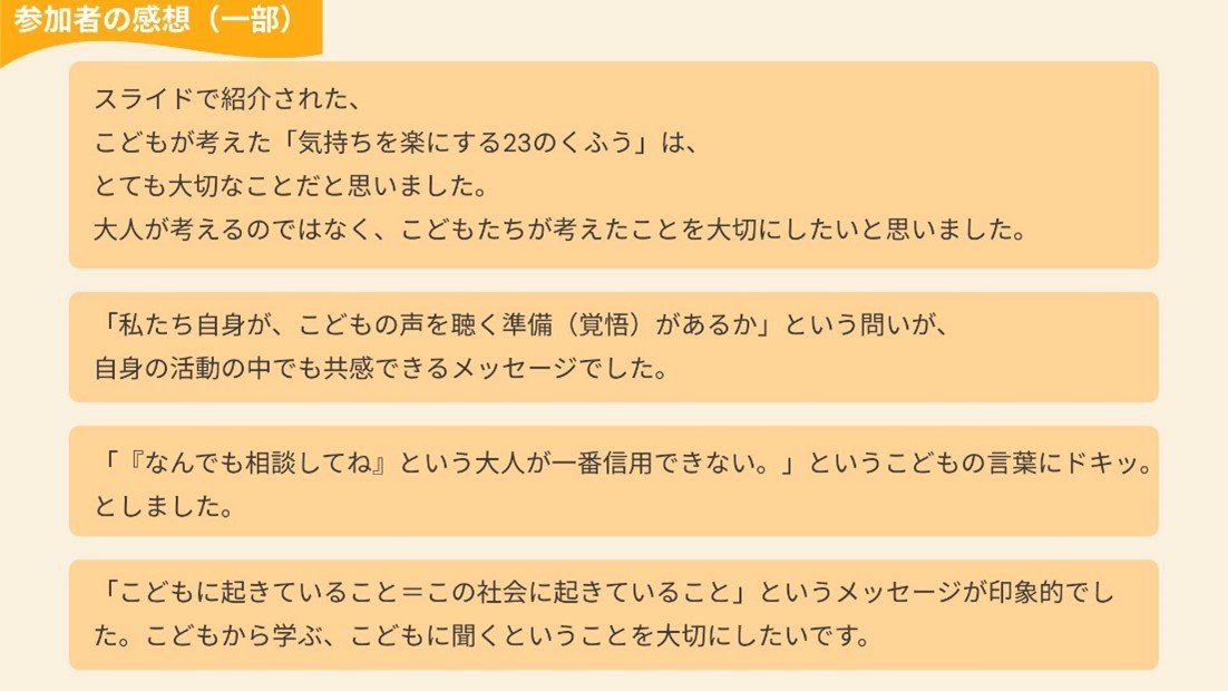団体の活動意義を改めて感じていただけたと同時に、一緒に取り組むスタッフへの知識の共有や、「こどもを尊重する」「こどもの声を聴く」スタンスを浸透させることで、より一人ひとりのこどもが安心して頼れる存在や居場所になれるよう取り組みたいと意識の変化をシェアしてくださる団体もありました。
