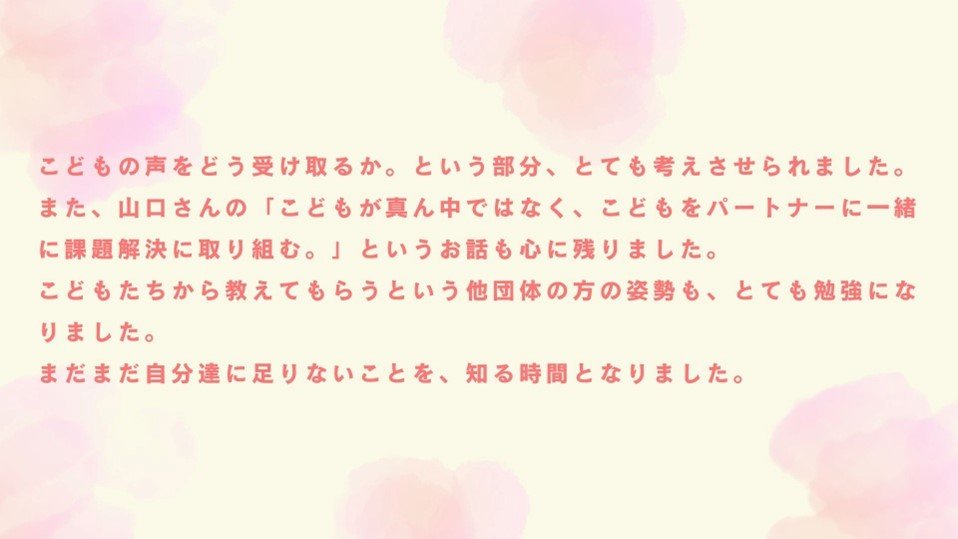 各団体5分という短い発表時間の中で、活動に参加するこどもたちや大人の様子を写真や動画で臨場感たっぷりに伝えたり、リアルな声を盛り込んだりしてくださり、活動のイメージやこどもたちのいきいきとした様子が思い浮かびました。